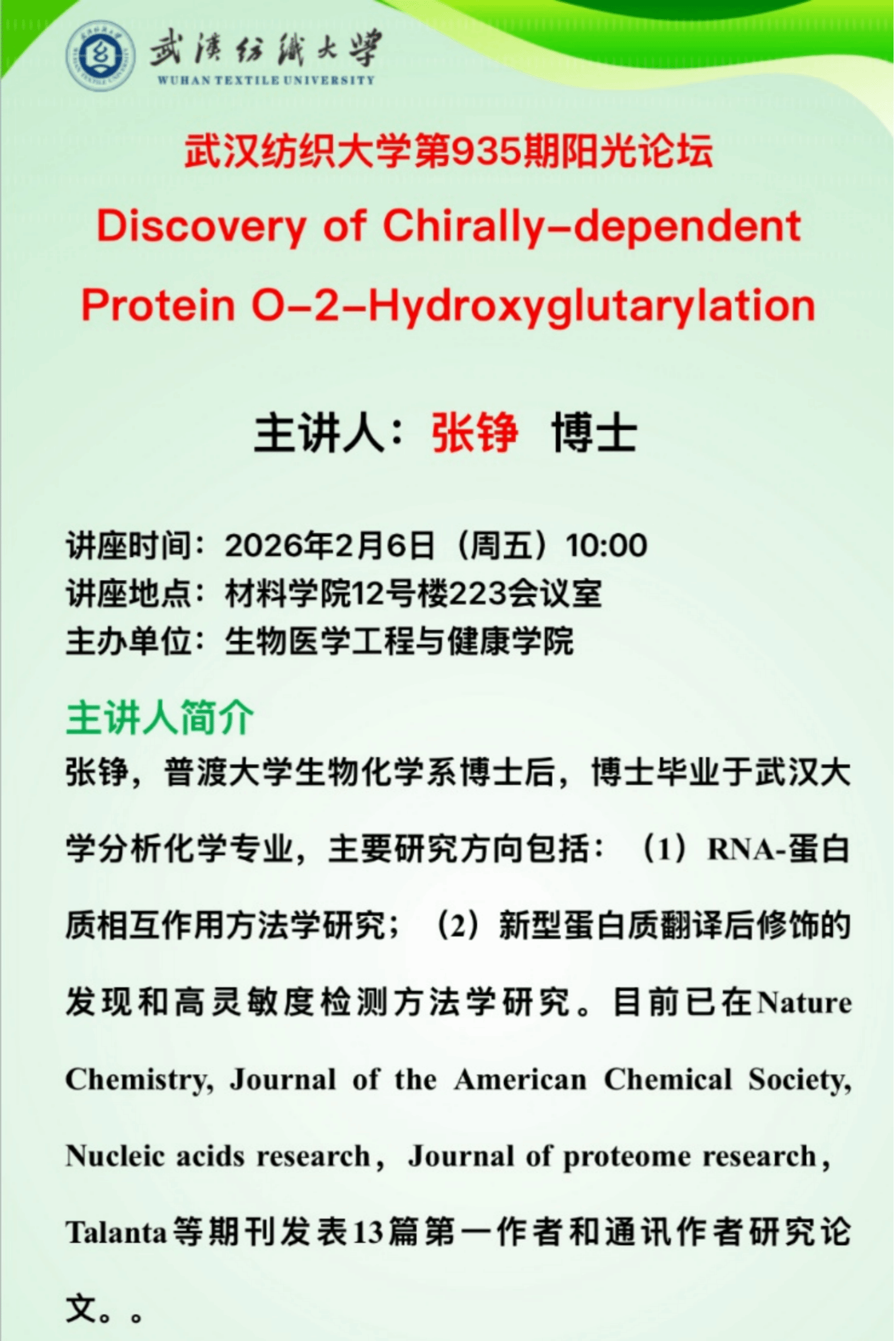 应2138cc太阳集团生物医学工程与健康学院冯钰锜教授邀请,普渡大学生物化学系博士后张铮博士于2026年2月6日上午,在材料学院12号楼223...