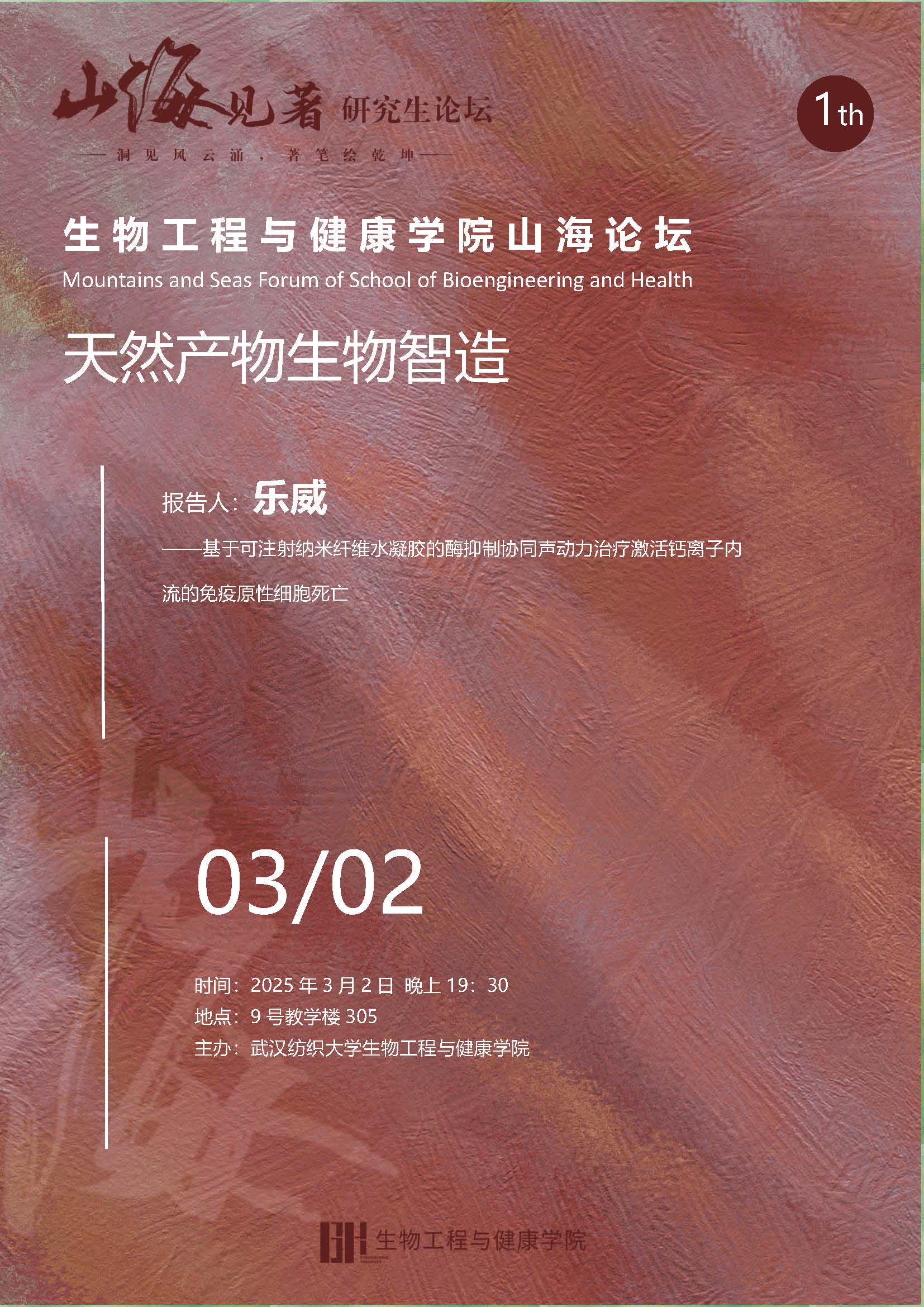 3月2日,2138cn太阳集团城主办的“山海论坛”在学校9号教学楼305教室举行。本次论坛主题为“天然产物生物智造”,由乐威同学带来题为《基于可注射纳米纤维水凝胶的酶抑制协同声动力治疗激活钙离子内流的免疫原性细胞死亡》的学术报告。