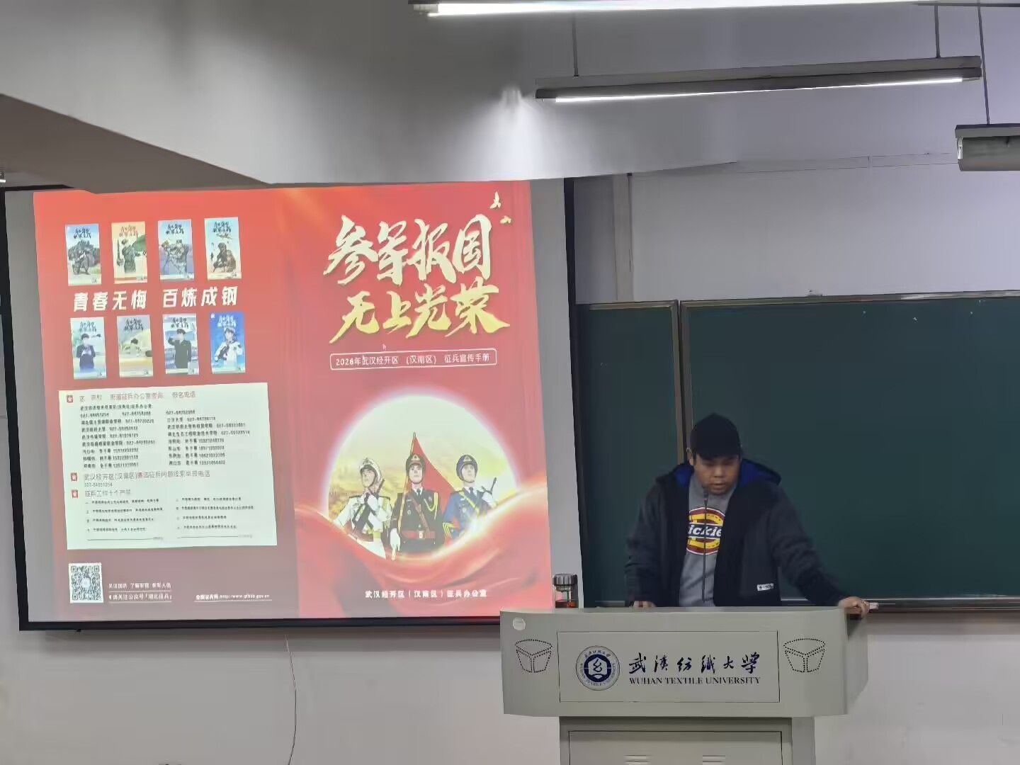 此外,朱一雷向同学们详细介绍了2026年征兵报名条件、入伍流程、惠兵政策等,并详细剖析了征兵诈骗的常见套路,强调了“认准官方渠道、拒绝金钱交易”等防骗要点,助力学生全面了解征兵相关事宜。帮助同学们明确了参军入伍的发展路径,为有志入伍的同学提供了清晰的指引。