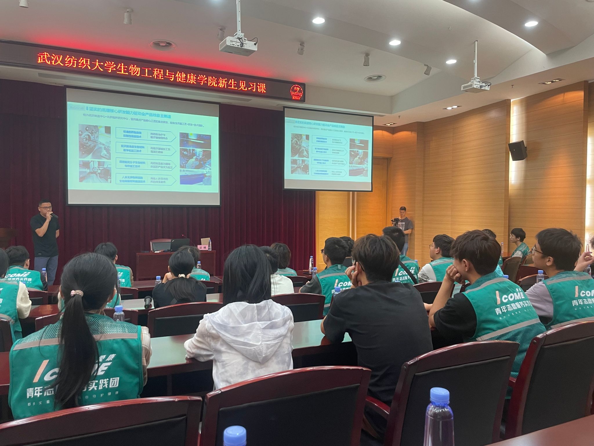 在学习交流环节,园区企业——柏为(武汉)医疗科技股份有限公司副总经理梁曦为学生们讲解了一场生动的“企业见习课”,同师生们一起分享和探讨了医疗器械行业的发展历程、当前挑战和未来趋势,并与学生们就如何将理论知识与实际工作相结合进行了深入的交流。