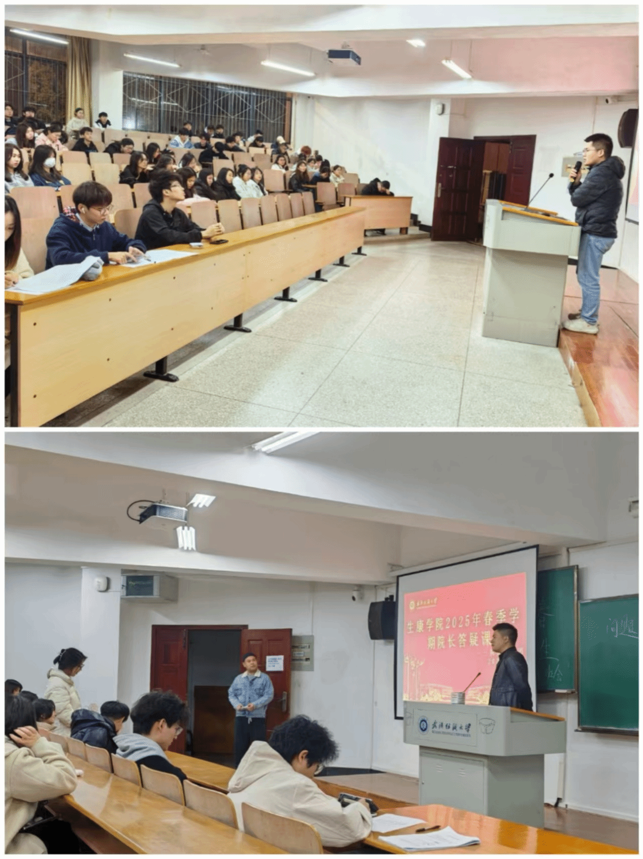 为深化师生交流、精准对接学生发展需求,3月2日,生康学院成功开展2025年春季学期第三期院长答疑课活动。本次活动特邀学院科研团队骨干曹俊老师与工会主席王俊杰老师联袂主讲,围绕学业规划、职业发展等主题展开深度对话,生康学院百余名学生积极参与。
