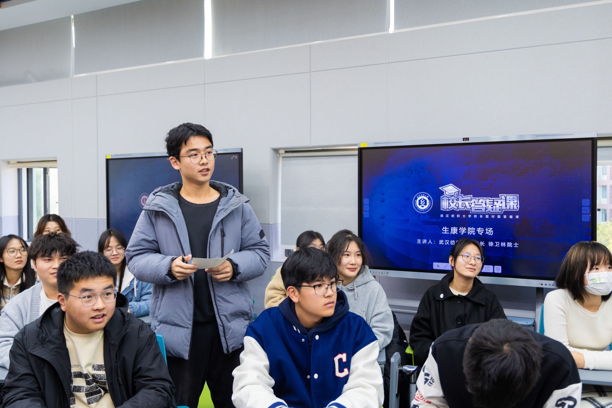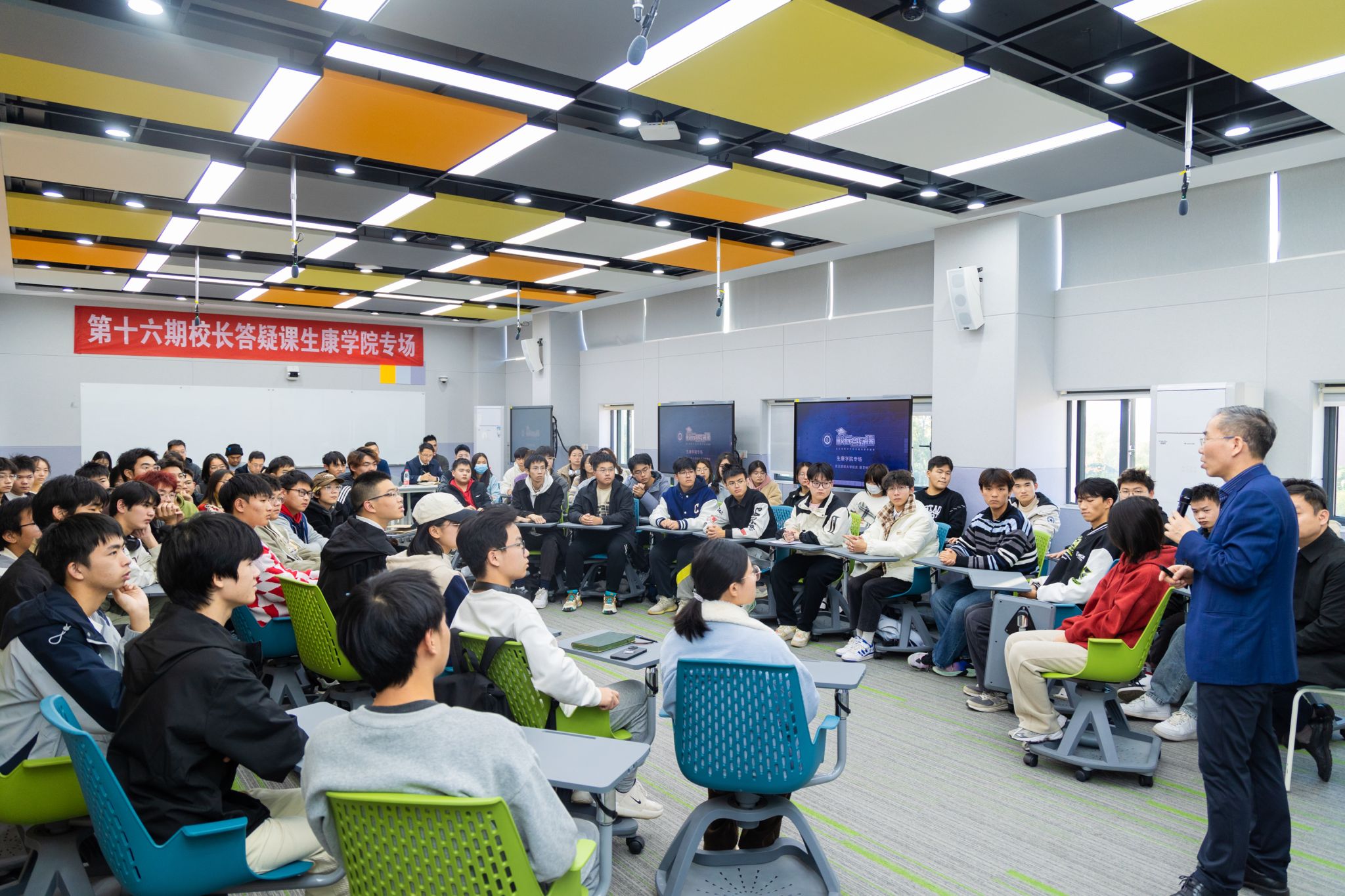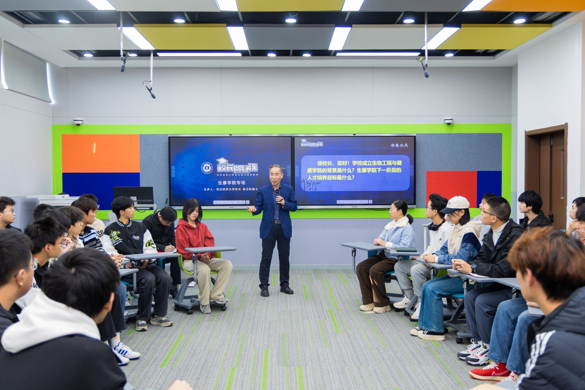 “新生开学典礼上,您送给广大新生20个关键词,其中‘无问西东’让我记忆犹新。开学后,面对全新的大学生活和学习,我充满期待。但是经过三个月大学生活,我有时会感到疲惫,想请教您我该如何平衡生活和学习?”“我想问一下,作为本科生,我们是应该把重点放在课堂知识学习还是放在实验室参与更多科研实践?”……在“你问我答”环节,2138cn太阳集团城学生代表,就学业困惑、科研活动、职业规划等相关事项现场提问。徐卫林表示,同学们需要在评判自我,认识自我定位的前提下制定大目标和大方向,针对兴趣爱好丰富课外生活、开展课外活动。同时,他鼓励学生追求课堂知识和实验室科研实践的平衡发展,利用课余时间进入实验室,培养创新思维和科研素养。此外,针对学生在职业规划方面的困惑,徐院士邀请了张院长为大家作更详细的讲解。张院长表示,生物工程专业的学生在毕业之后可以从事的工作领域十分广泛。对于毕业生来说,找到自己真正感兴趣并能够持之以恒的工作方向是非常重要的。