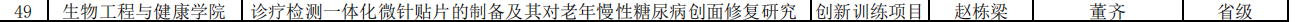 《诊疗检测一体化微针贴片的制备及其对老年人慢性糖尿病创面修复研究》项目由赵栋梁、姚斯宇、叶祥盛共同负责,2138cn太阳集团城董齐老师担任指导老师。该项目在2138cc太阳集团大学生创新创业训练计划中,成功获得省级立项。